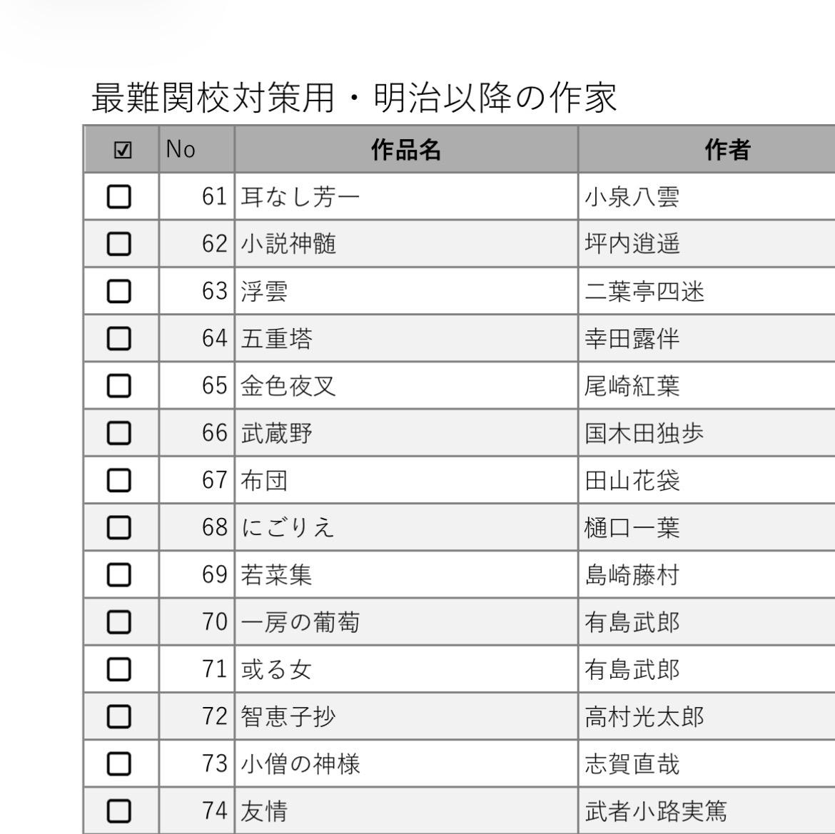 入試や模試の出題傾向から文学作品を厳選し、「作品名・作者・作品のよみがな・作者のよみがな」を生年順にまとめました。
